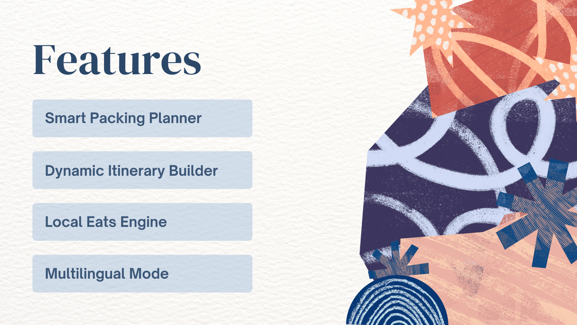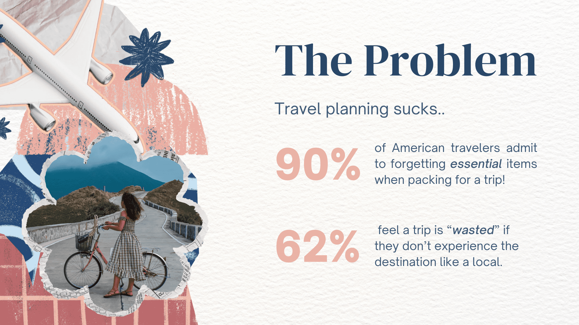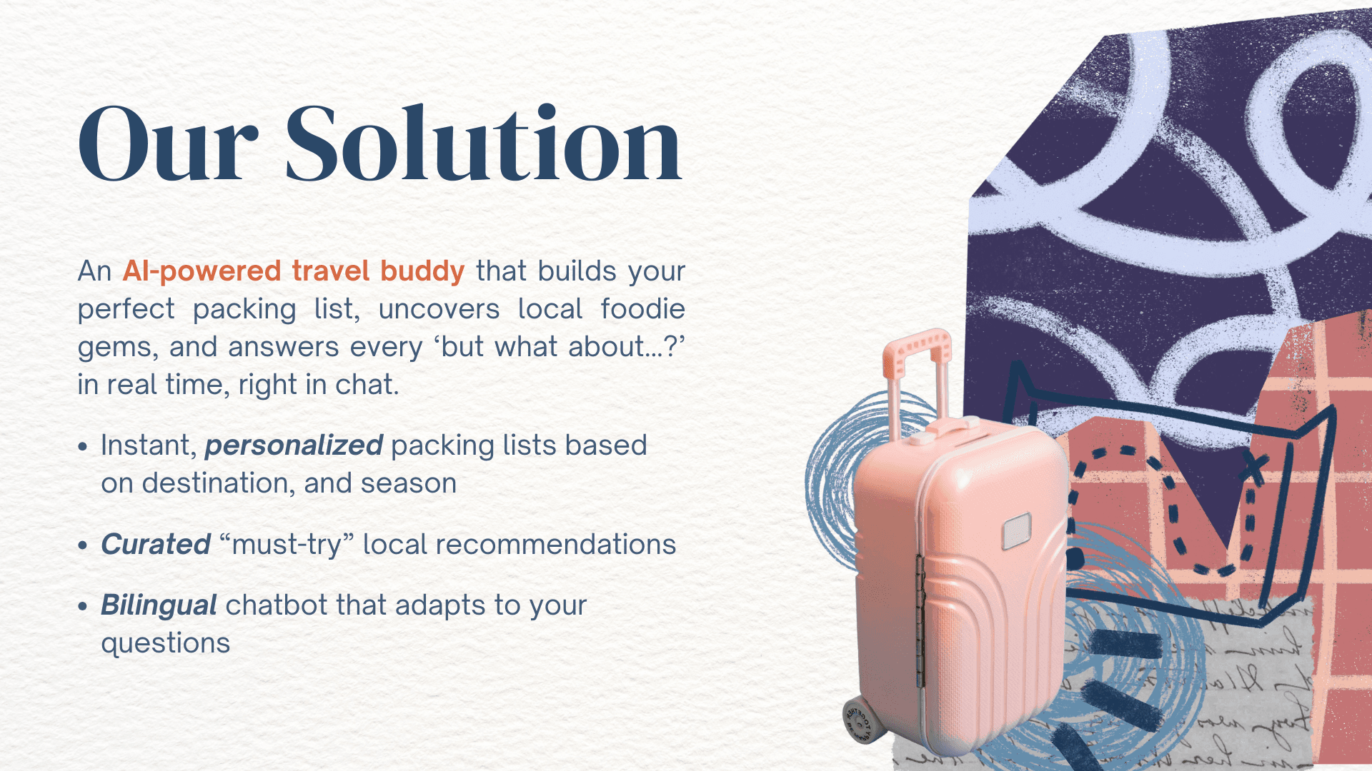 While travel information is abundant, personalized guidance is not. Travelers must manually piece together packing lists, local recommendations, and activity plans from disconnected sources. This fragmented process leads to overpacking, missed experiences, and a lack of confidence going into a trip, especially for younger, less experienced travelers.